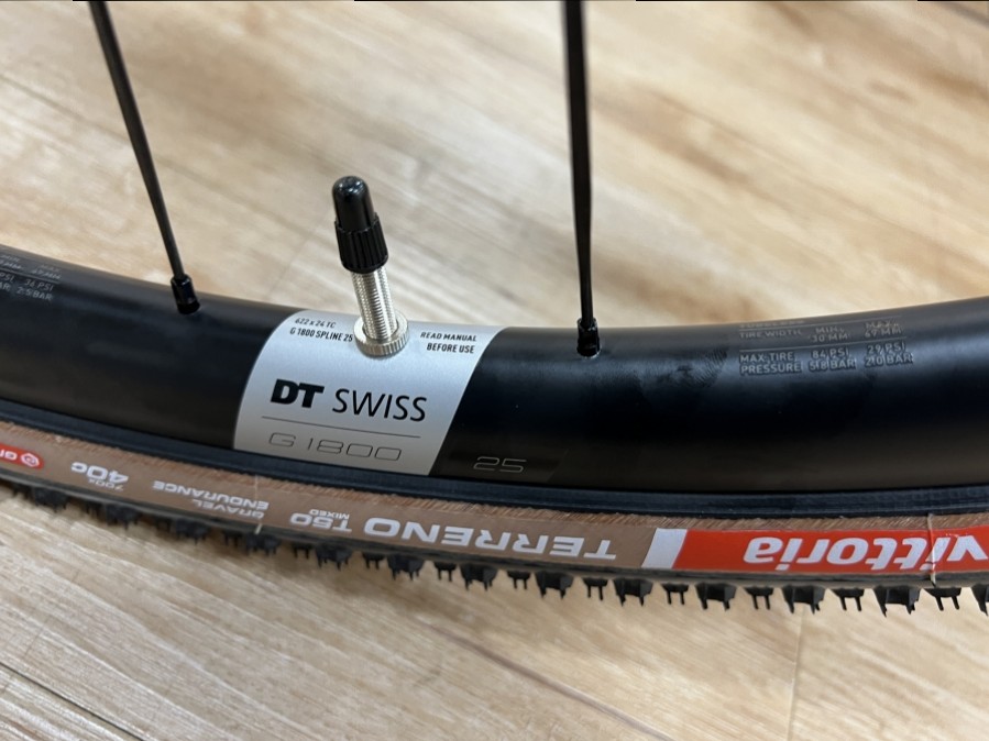 グラベルになると完成車付属のホイールセットの名前を聞いてもいまいちピンと来ないかもしれませんが、こちらに採用されているG1800 Splineはスポーク本数24本でストレートタイプ、内幅24mm、外幅28mmで対応タイヤ幅目安:32-60mmです。実売7万未満のグレードでありながらリムの溶接もキレイでなかなかカッコイイですね。調べると大体1,800g程度みたいです。ちょっと重いですがカテゴリー2に分類される頑丈なホイールなので思う存分オフロードが走れますよ。