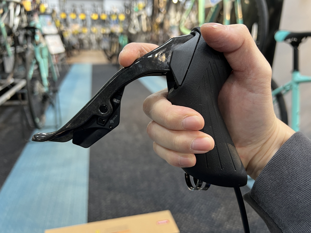 本当これに尽きますね、各方面E1世代のレバー形状は絶賛の嵐ですが握ってみれば納得です。ブラケットポジションで指4本が入った状態で親指の位置には拡張性の高いボーナスボタンが配置されています。ブレーキ性能は内部構造が直線化されたためワンフィンガーでのブレーキが可能になっています。