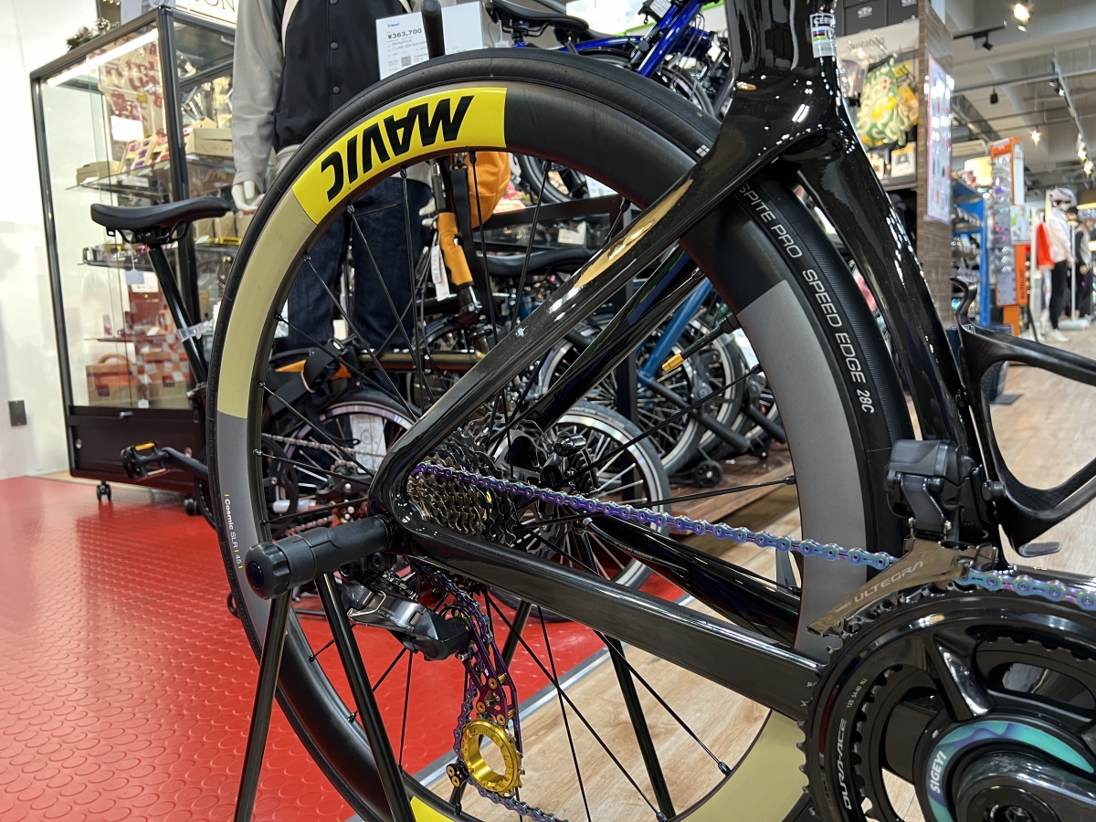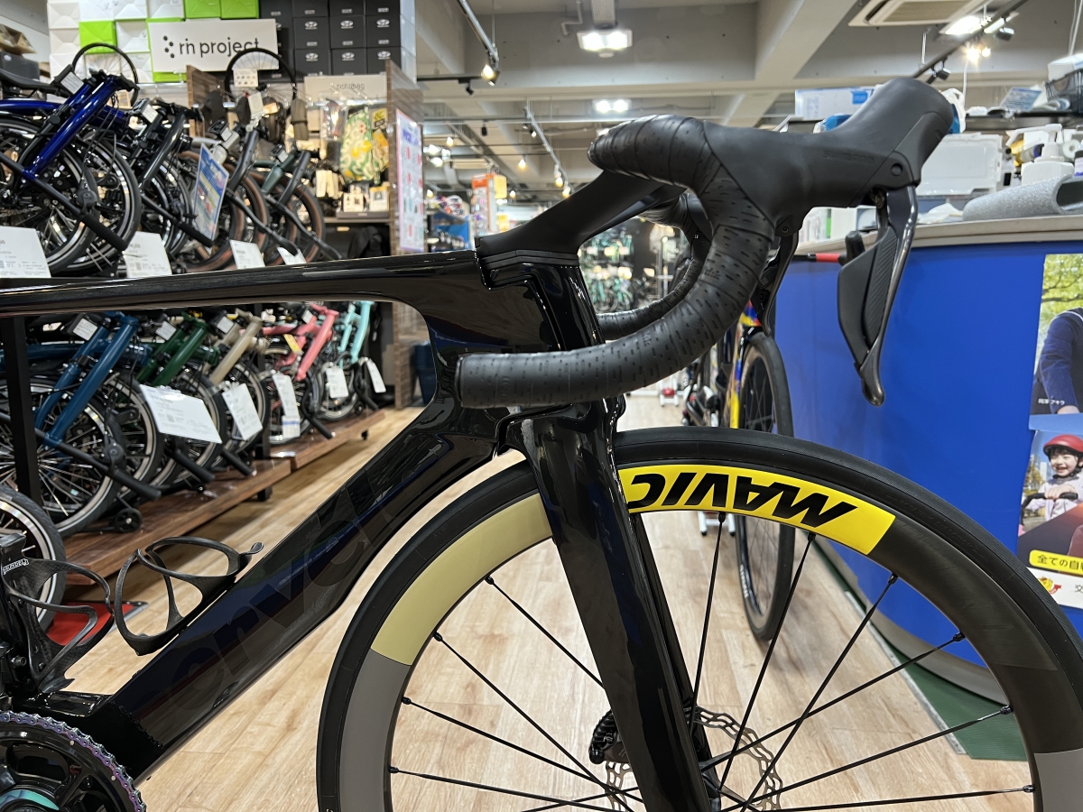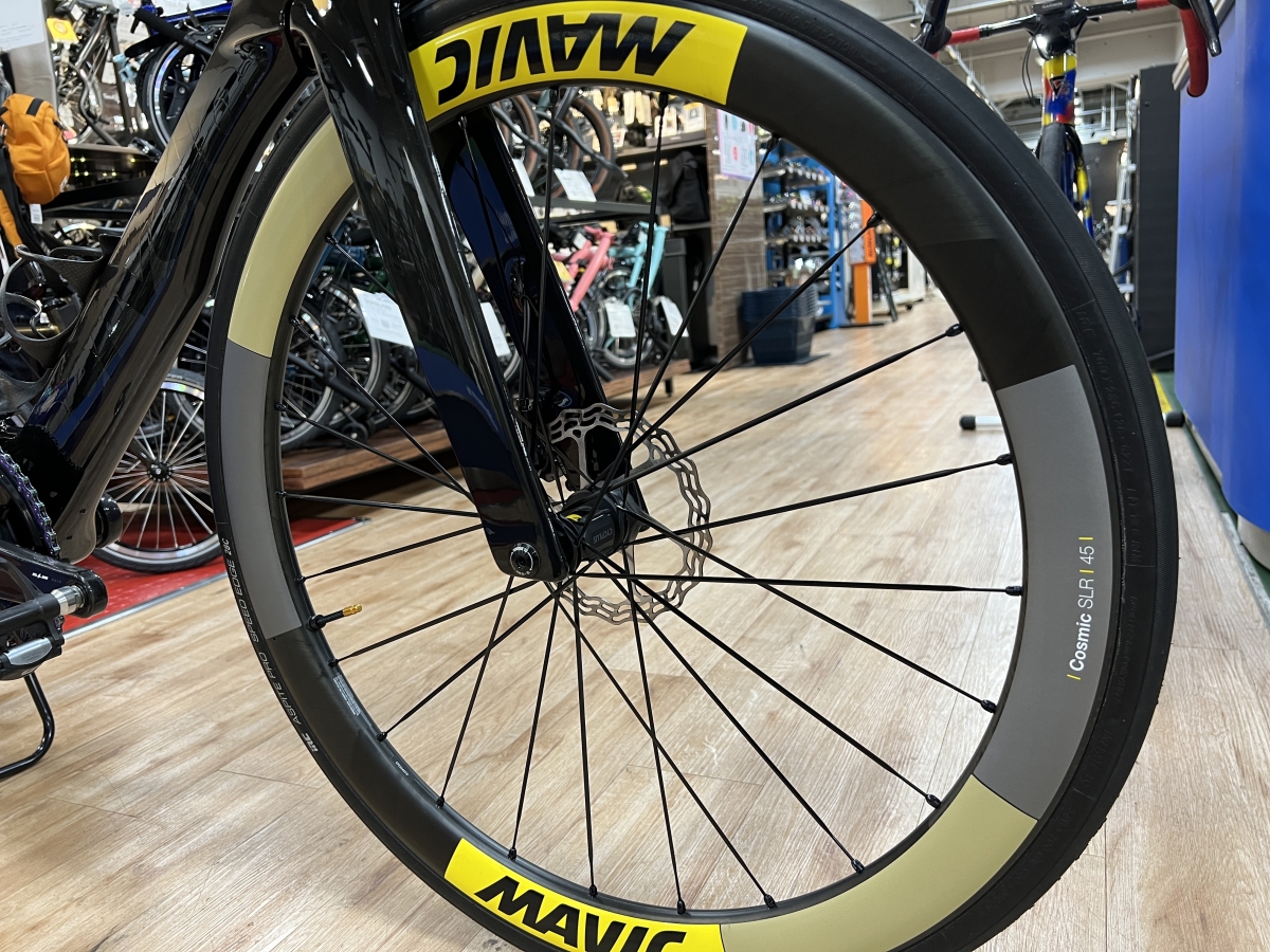 黒基調の車体の印象を華やかに彩るのはフランスの老舗ホイールブランドMavicのCosmic SLR 45 Discしかも国内限定のモデルになります。リムに穴を開ける代わりにねじ切りされた金属インサートがリムの下部ブリッジのドレープに組み込まれスポークを直接ねじ込むことができるフォアカーボンテクノロジーや、超軽量で効率的特大の非接触ラバーシールが摩擦を最小限に抑えメンテナンスも簡易なインスタントドライブ360フリーホイールシステムを備えた質実剛健な性能です。
