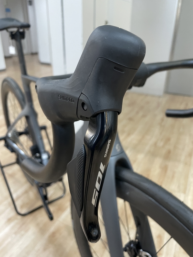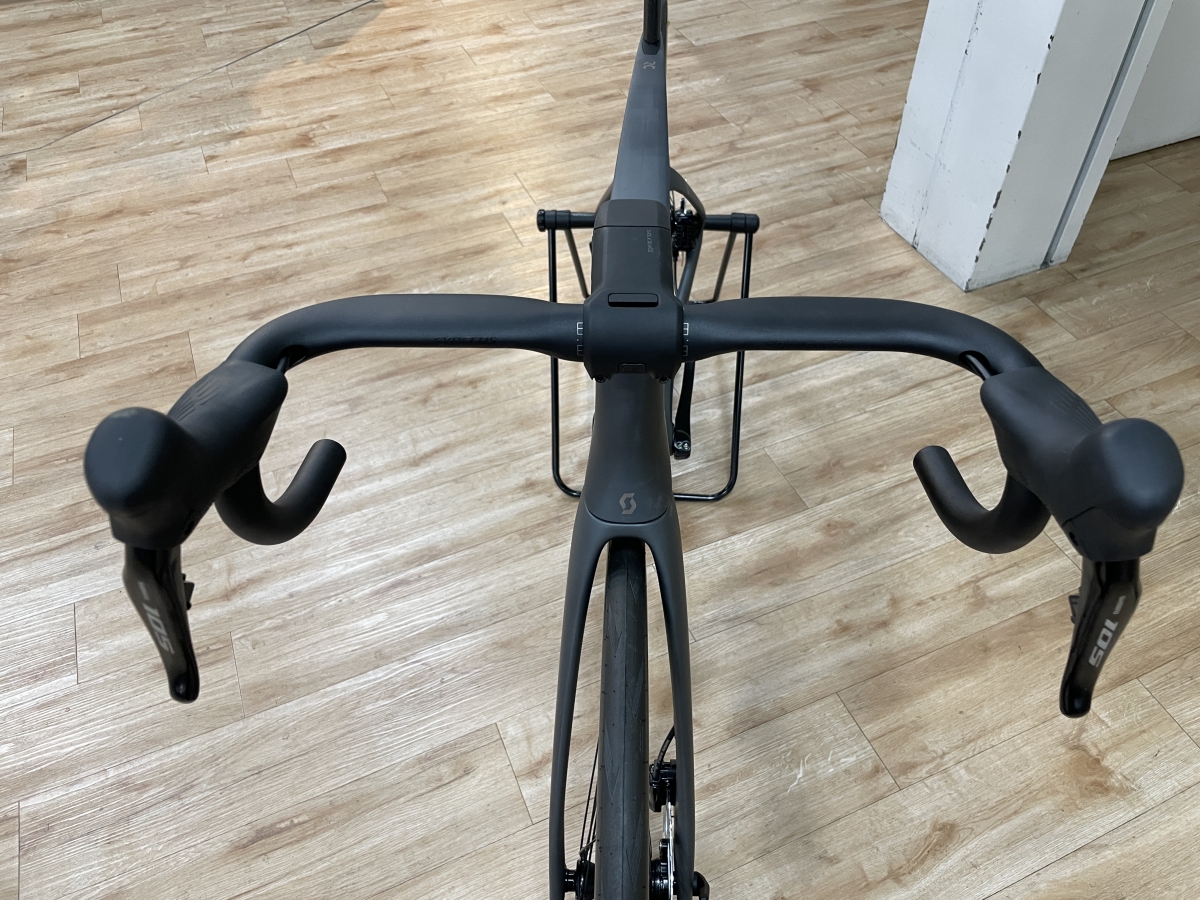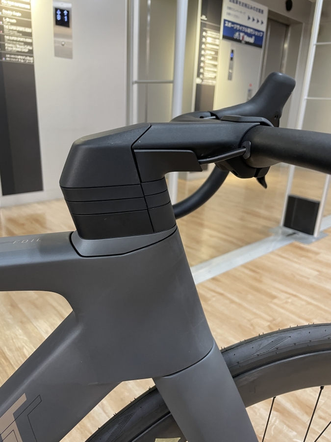 専用のエアロステムに、エアロハンドルが取り付けられているので、かなりすっきりとしたフロント回りになっています。