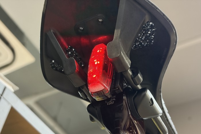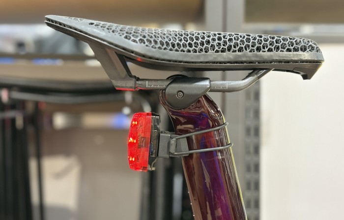これを機にリアライトも買い替えよう!と思い、 Type-C 充電対応の小ぶりな「nano 60」を購入したのですが、なんとレールと座面の接合部にライトが収まる十分な幅がなありませんでした。僕の使うサドルの場合、一般的な座面から直接レールが生えるような構造ではなく、大きな樹脂パーツが座面とレールをつなぐ構造になっています。このせいでライトとの干渉が起こってしまったようです。