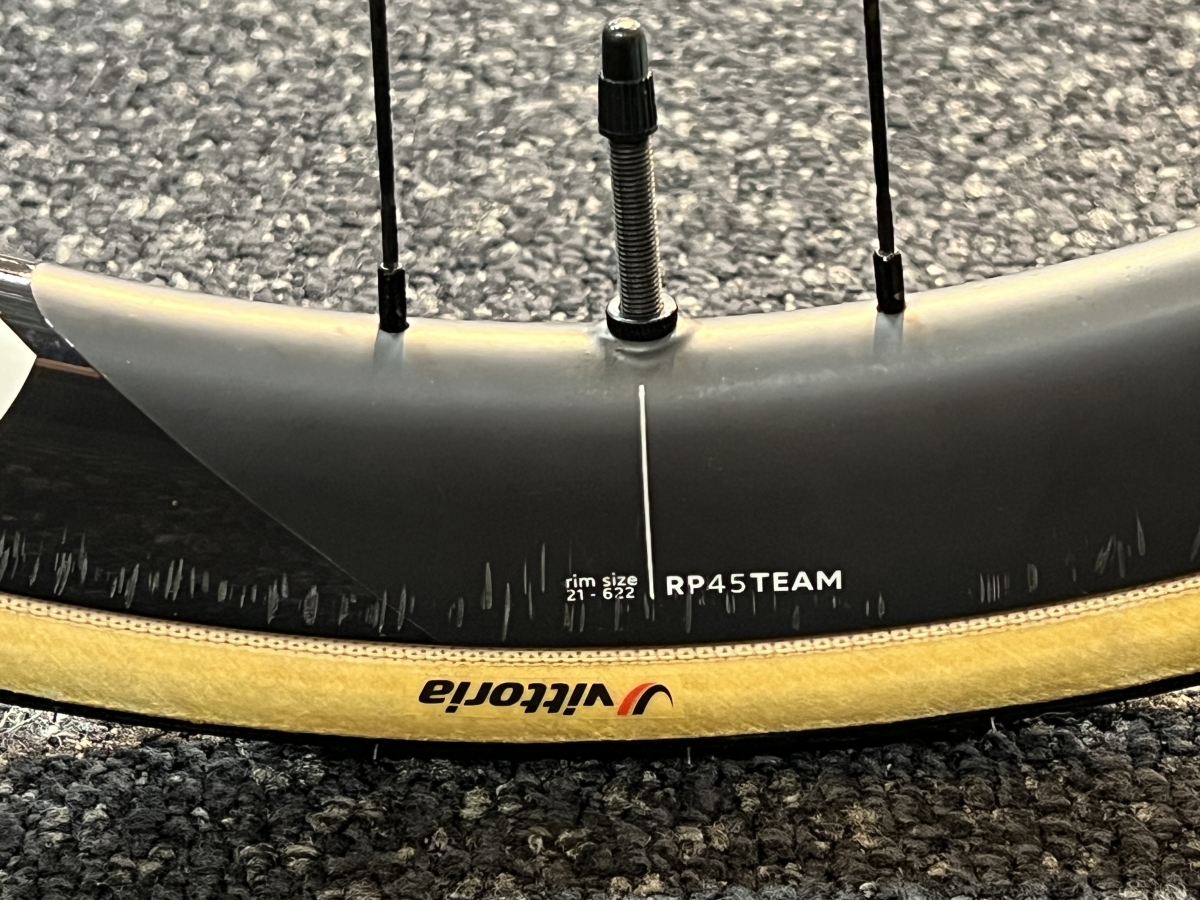 コンポは全て最新のR9270デュラエースで統一されていて、ホイールはOQUOのRP45TEAMです。ホイールにははすったのか縁石に擦れたのか側面に傷が多いですがフレームの傷はそれほど気にならないのでかなり綺麗に使用されていたようです。とは言えレース使用された車体の為ホイール交換時にフォークを地面に置いて付いた傷や、クランクの擦れ等ありますので実物をよくご覧になってからお買い上げください。