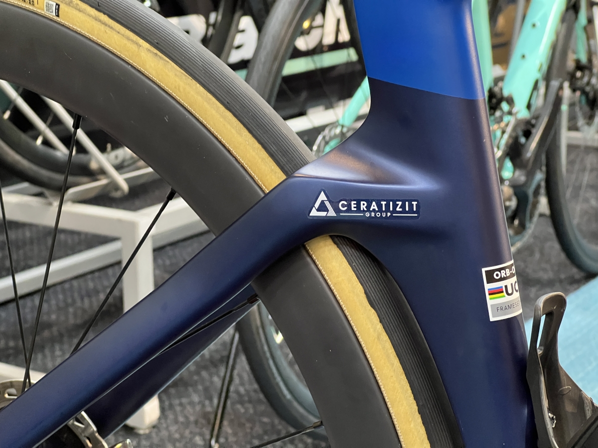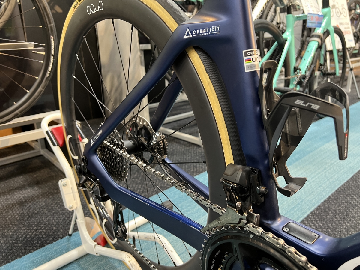 こちらのモデルは残念ながら昨年レース活動が終了したセラティジット・プロサイクリングチームの選手が実際に使用していたORCA AEROになります。ツールドフランス・ファムにも参加していたのでもしかしたらこの自転車もフランスの土を踏んでいるのかもしれませんね。選手のネームステッカーが貼ってあった形跡はございますが