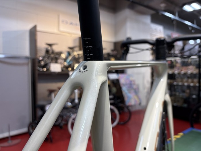 シートチューブ上端にシートステーが接合する、昨今では珍しくなったフレーム造形が採用されています。現在店頭に並ぶバイクはその多くがドロップドシートステーですが、第7世代となる現行のORCAは世代が変わってもこの美しい形状を継承し続けています。このある種の”自転車らしさ”に惹かれる方も一定数いらっしゃるのではないでしょうか。