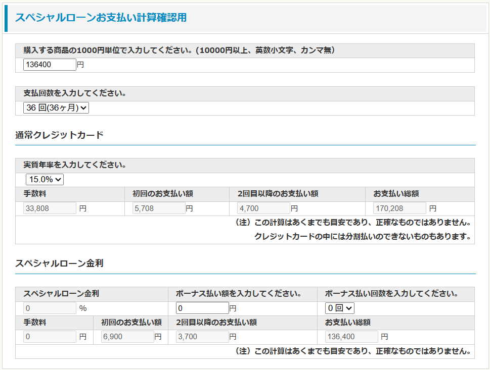 最大36回分割での支払いを実質年率15%のクレジットカードで行った場合と、特別無金利ローンの場合と比較します。