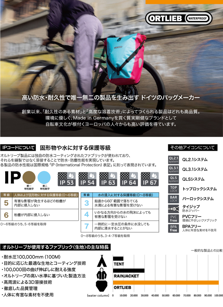 1982年創業のORTLIEB(オルトリーブ)社は、「独自の素材」と「溶接方法」で、機能性・耐久性を追及した世界にも優れたクオリティを誇る防水バッグメーカーです。引き裂け強度、折り曲げ加工、摩耗性、暖冷耐久性に優れた独自素材にコーティングを施し、縫い合わせをしない独自技術の溶接をすることで高い防水・防塵性能を実現しています。
