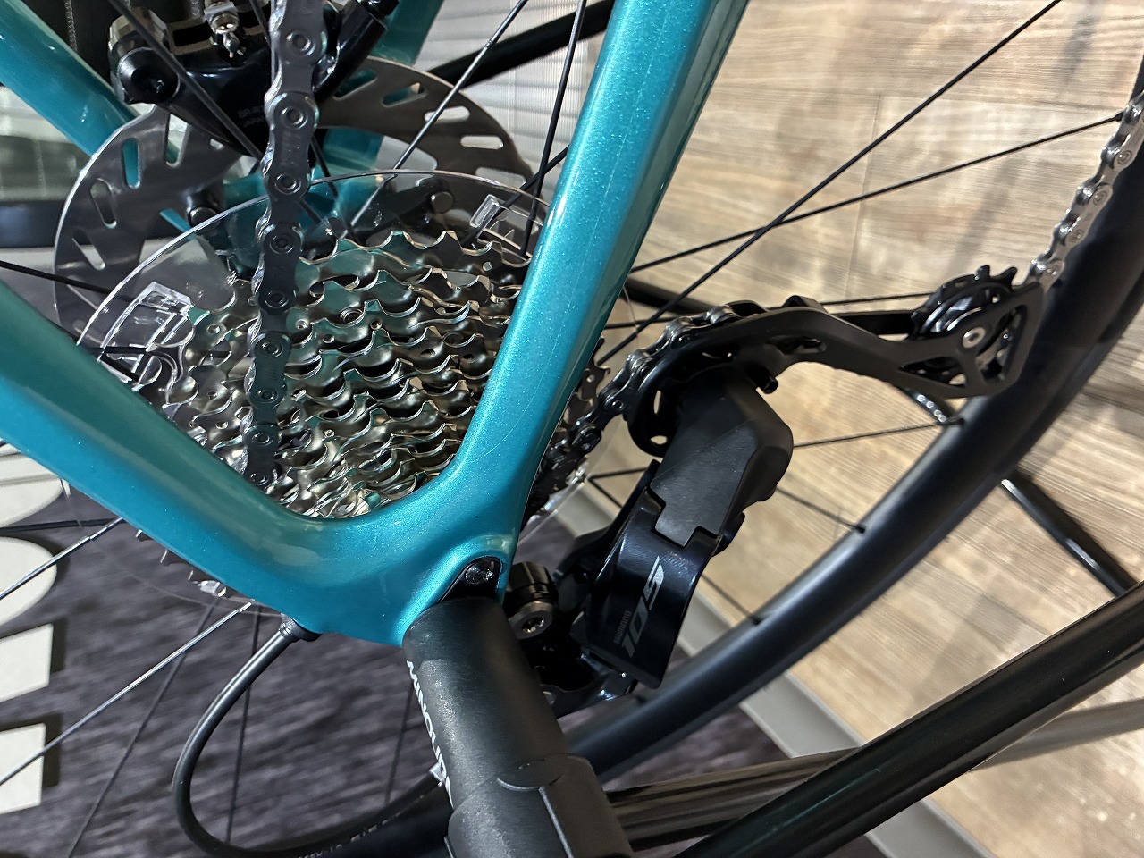 ダウンチューブはしっかりと剛性感を感じる多角形状でリア3角はコンパクトな今時のカーボンフレームの造形で反応の良さも見てとれます。