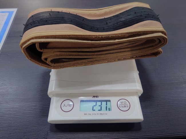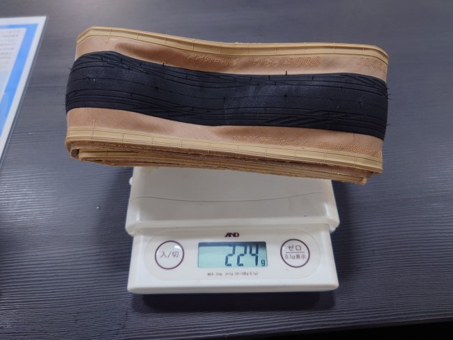 私が選んだのは700×28c。カタログ値230gに対して、実測値が224gと231g。