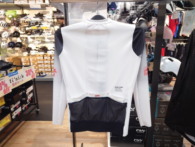 高通気素材を採用して日焼けも抑えるロングスリーブモデル。ソフトで通気性のよいグリッドピンメッシュ素材を全パーツに採用。走行風を取り込む低い襟の仕様など、酷暑時のロングライドも快適。