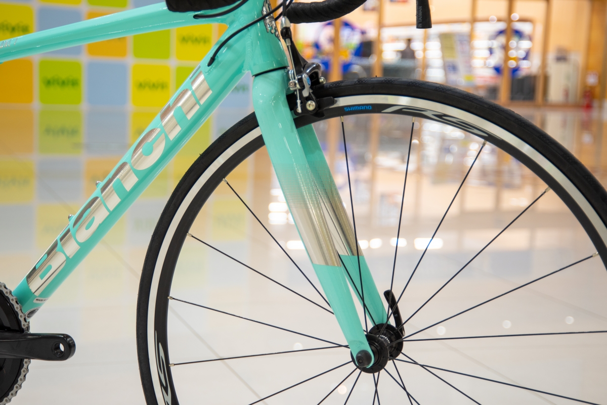 カーボンフォークを採用することで振動吸収性と軽量性が向上。リムブレーキ仕様ということもあり標準装備のタイヤが700×25C。28Cが限界といった所でしょうか。