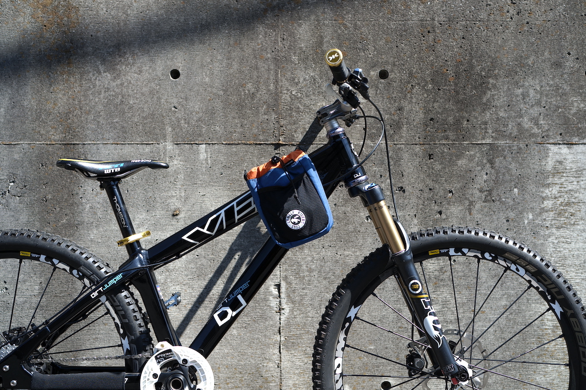 ハンドルバーに取り付ける方が多いかなと思います。こんな感じです。ただ、私の自転車の場合は、ワイヤーが邪魔になってしまったり、ダートジャンプという特殊なフレーム形状のため、この位置はあまりフィットしなかったので、
