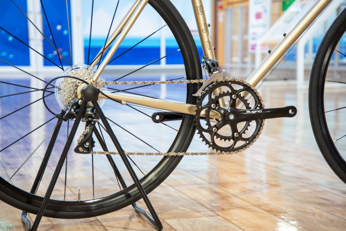 クロモリフレームの世界観にマッチする「Sugino」製クランクを標準装備。見た目を考えるとシマノよりもこっちの方がイケてるかも!