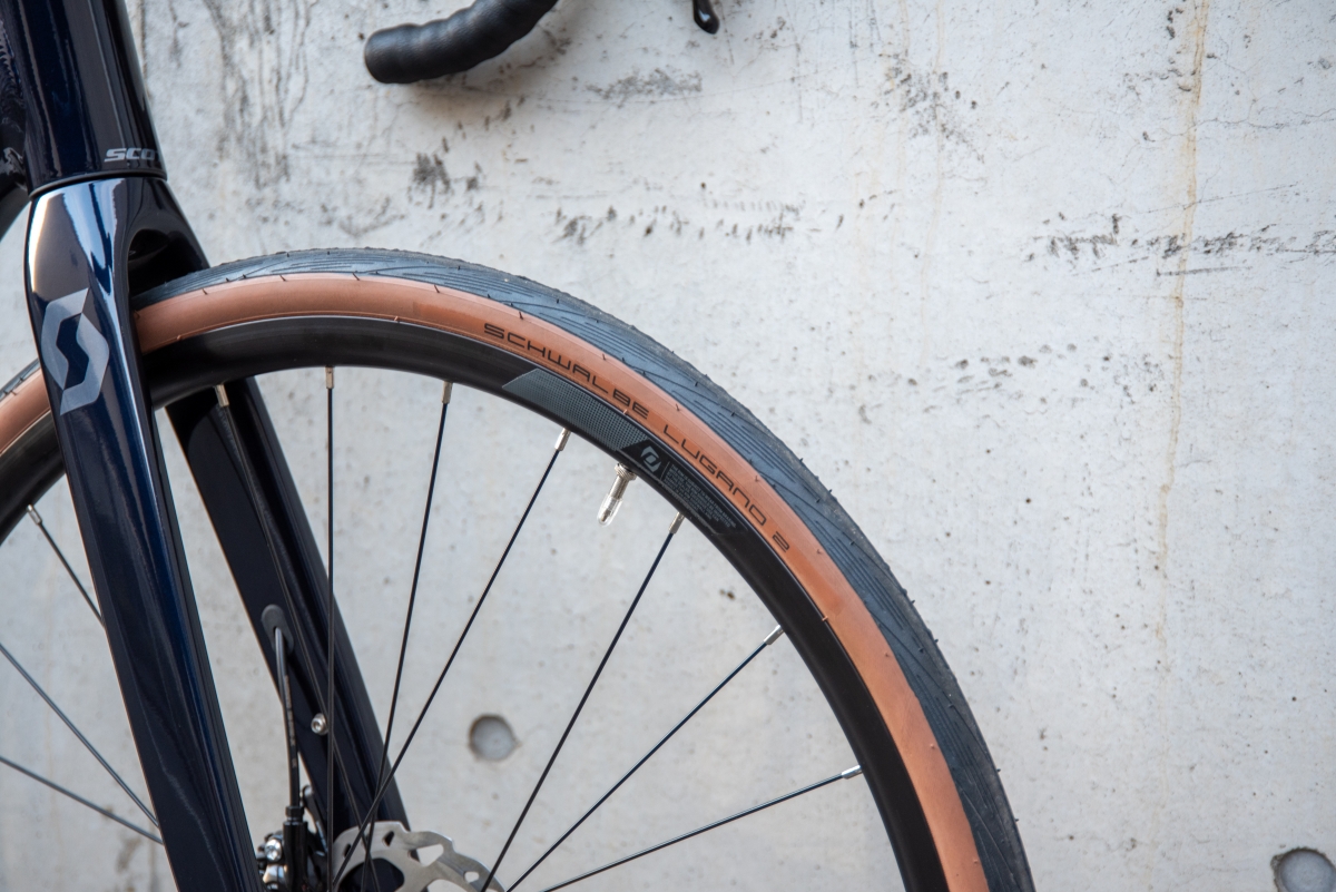 タイヤは700×32Cの太めな「SCHWALBE LUGANO2」を搭載。耐久性が高く通勤や通学は勿論、休日のサイクリングにも最適なタイヤです。