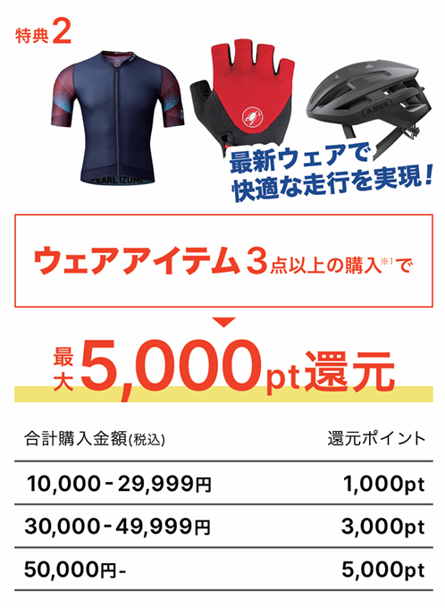 ポイント還元祭期間中なら、ウェアアイテム3点以上のお買い上げで、購入金額に応じてワイズポイントを還元中!