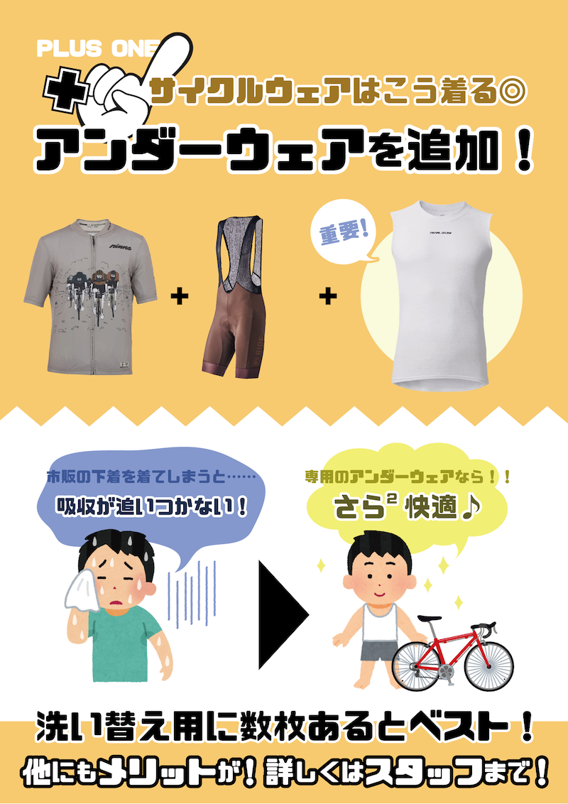 サイクルウェアにとって、とても重要なアンダーウェア。素早く効率的に汗を乾かすことにより、不快感や汗による冷えを抑制し、結果的に体力の無駄な消費を抑える効果があります。
