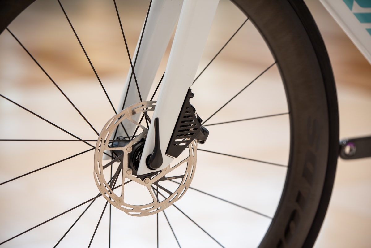 フロントフォークはCF5素材で勿論統一。 フロントフォークエンド部は末端を切り落とすことで空力性能の向上を実現。随所にエアロ効果を高める工夫が施されています。