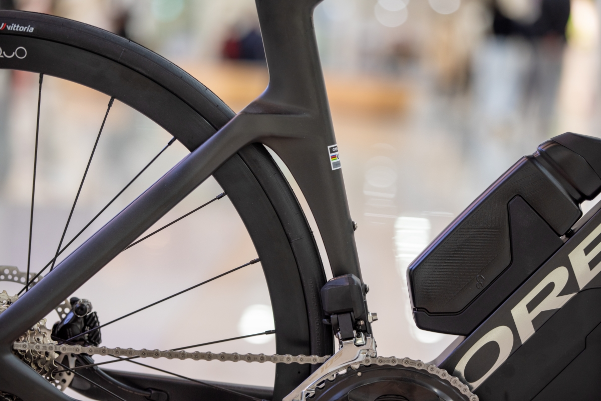 チェーンステーも特徴的となっており、前方からくる風に対してリアディレイラーが隠れるような形となっています。