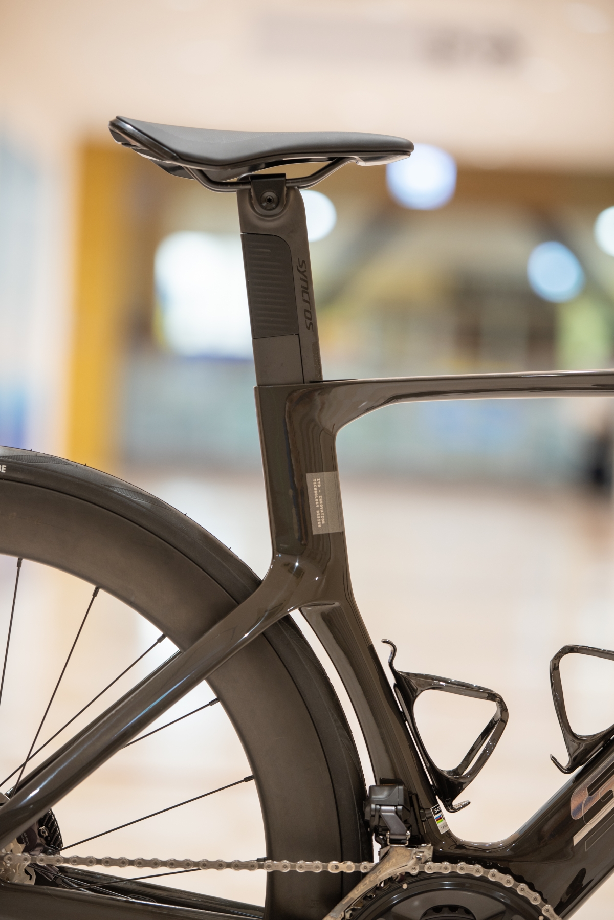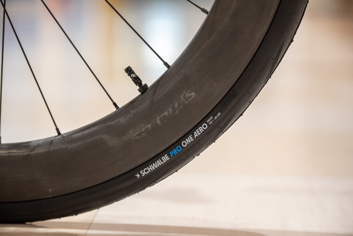 ホイール・タイヤには”Syncros Capital 1.0 Aero 60mm”+”Schwalbe PRO ONE Aero TL-Easy Fold 700x28C(クリンチャー)”が標準装備。チューブレスを愛用しているお客様のご要望でこちらも勿論チューブレス化。
