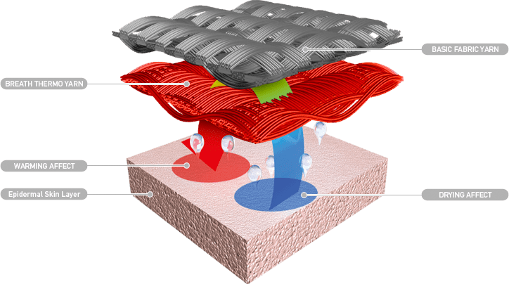 人体から常に発散される水蒸気を吸着します。水蒸気=水分子の運動エレルギーは、繊維の表面に吸着されて身動き出来なくなると、熱エネルギーに変わり発熱します。