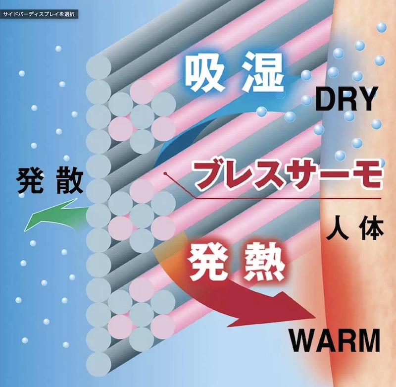 吸湿発熱素材「ブレスサーモ」は、人体から発生する水分を吸収して発熱効果をもたらします。また、吸湿発熱した空気を繊維間に取り込み保温するため衣服内をドライで温かな状態にします。