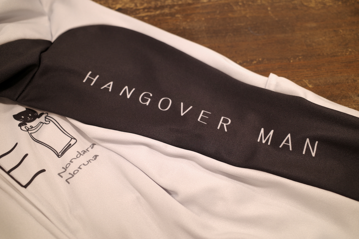 サイドには「Born to Drink(飲むために生まれた)」「Hangover Man(二日酔い野郎)」の文字をプリント。