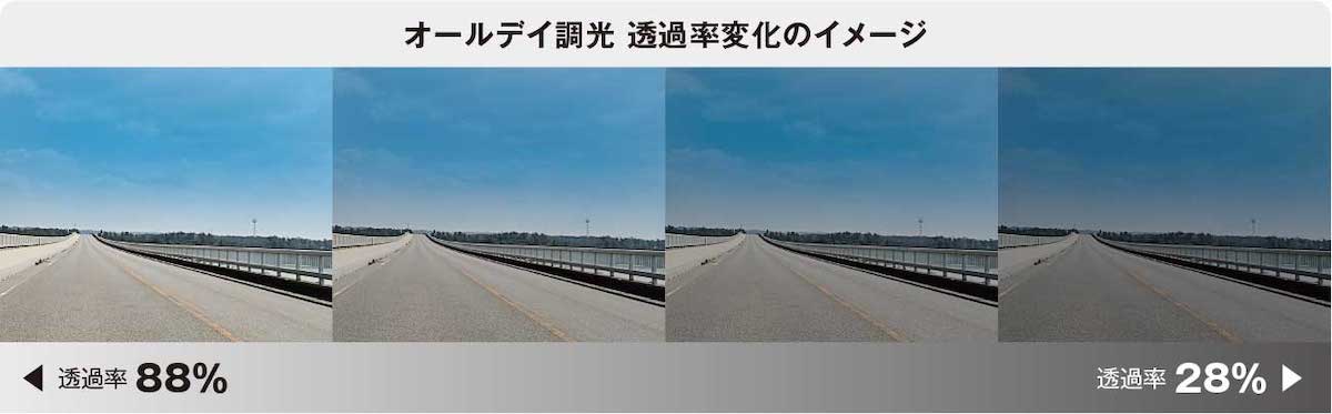 紫外線量に応じて可視光線透過率が88〜28%に変化します。室内や暗い時間帯では薄い色に、室外や日差しの強い(紫外線量の多い)時には濃い色に自動で変化します。