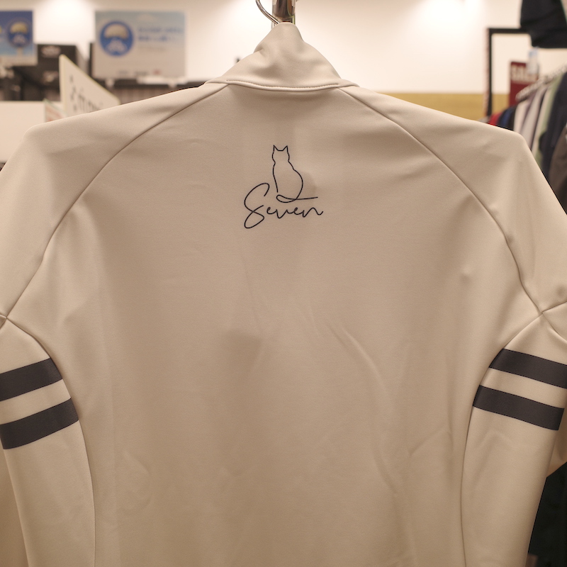 胸元には一筆描きの猫がデザインされています。背中も首元にワンポイントのシンプルなデザインです。