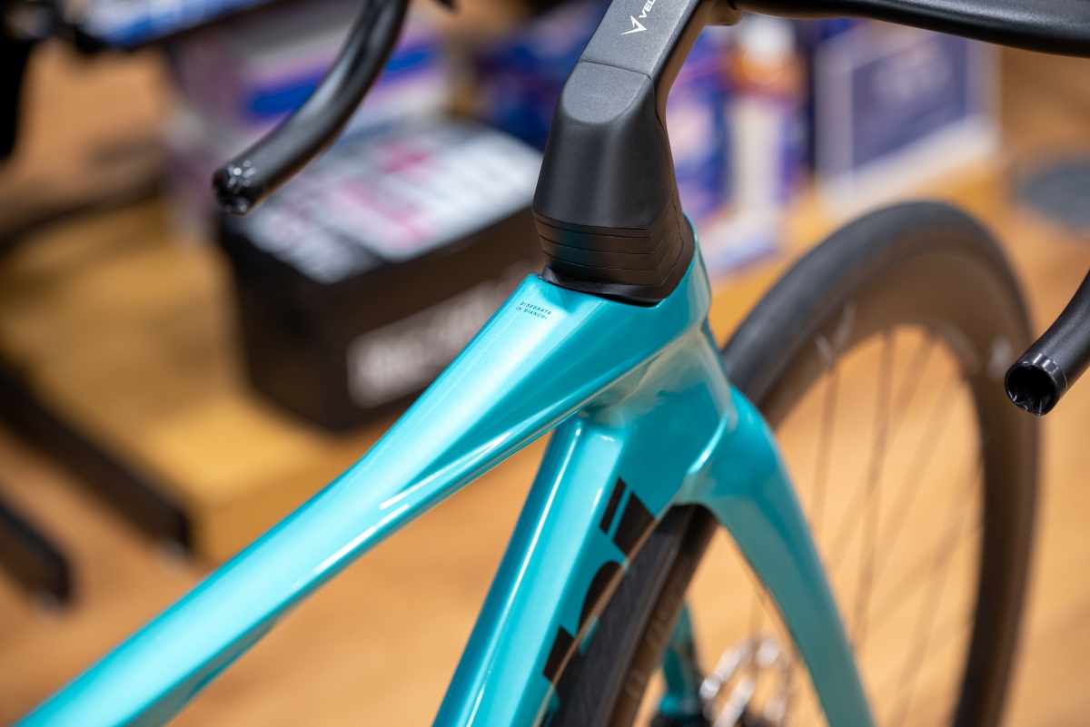 特徴的なヘッドチューブのエアロギミックやCVの採用による快適性の向上こそはコストダウンの影響で非採用ですが、フレーム設計は上位モデル譲りのエアロ性能を誇ります。
