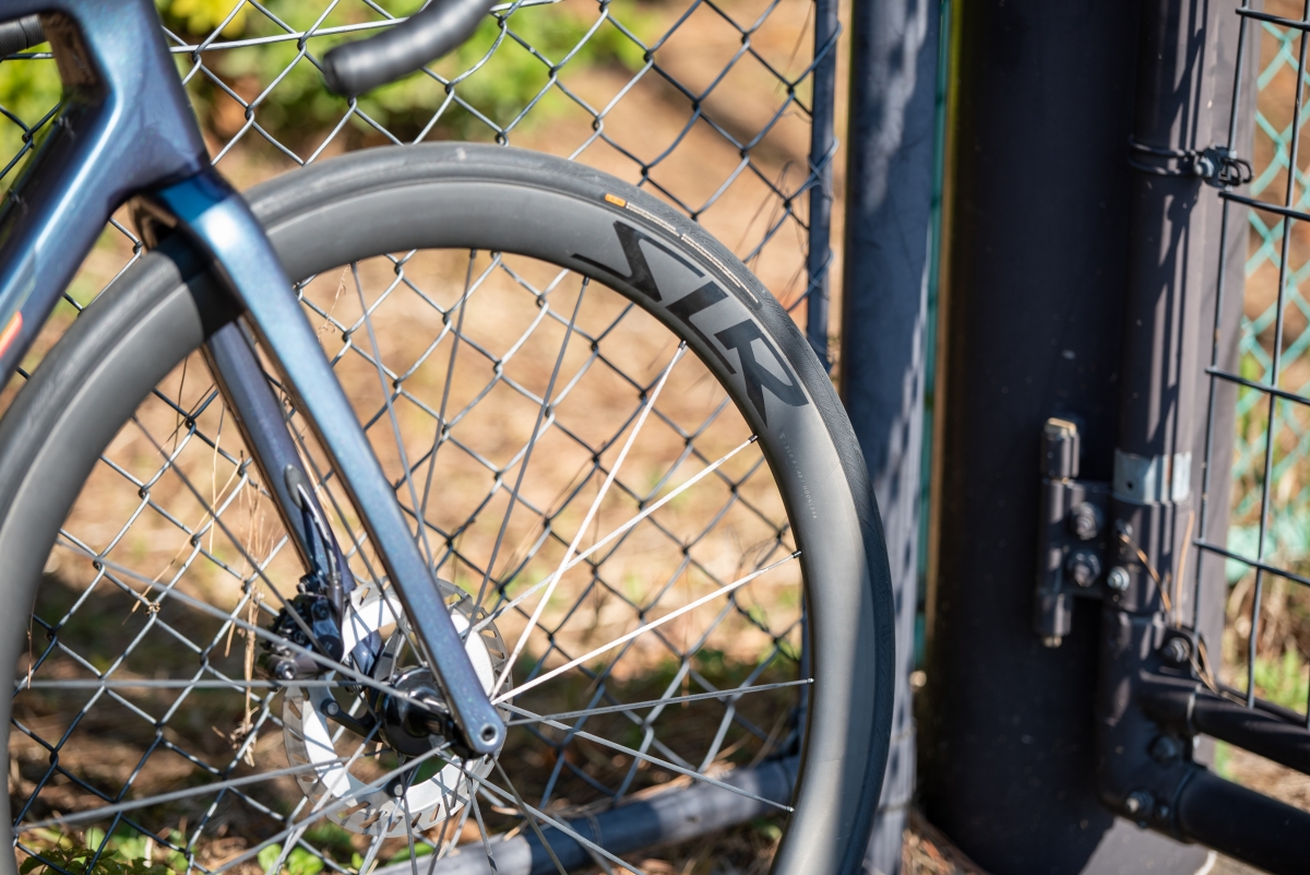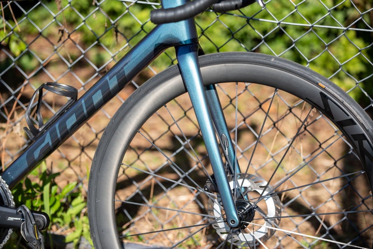 ホイールはGiant SLR 0 40mmハイトを搭載。1,300g台の軽量カーボンホイール。スポークもカーボン素材。