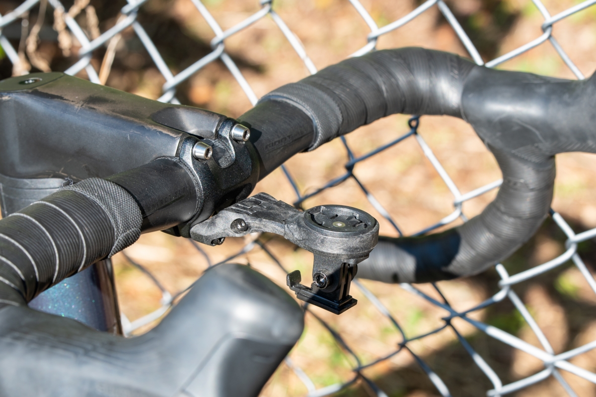 サイクルコンピューターマウントは下側ハンドルクランプボルトを使用して固定するタイプ。