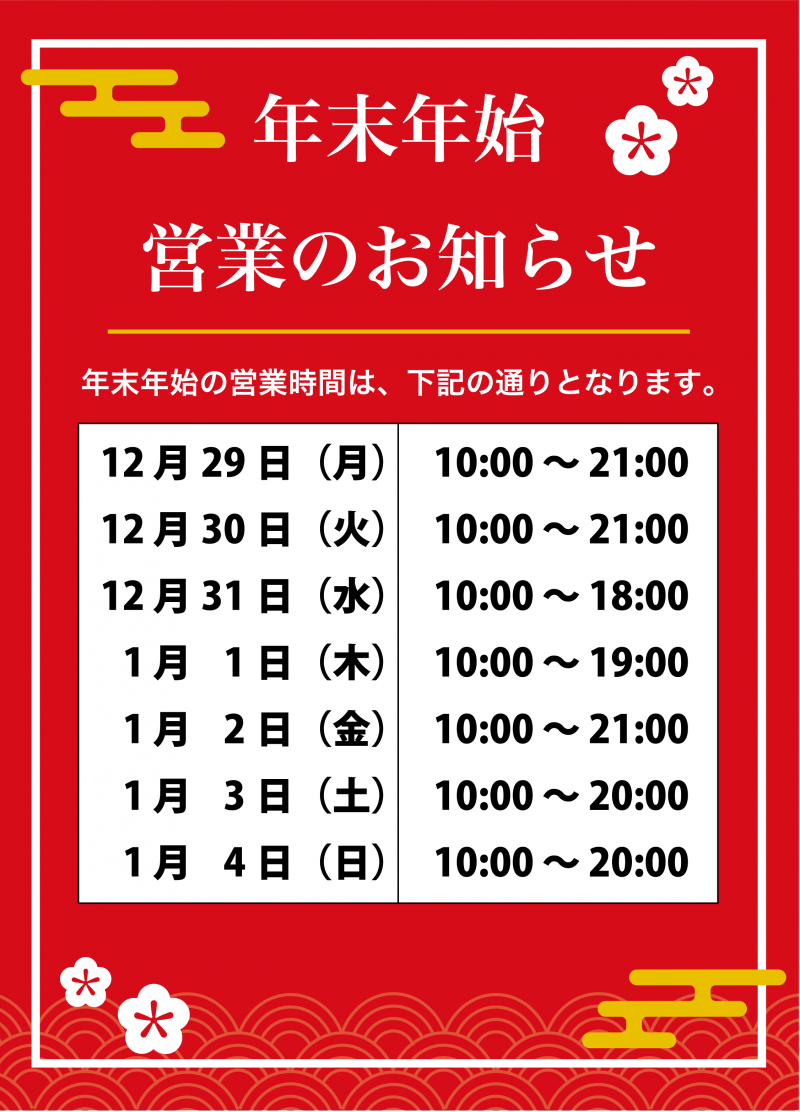 本年も残りあと、わずかとなりました。当店の年末年始の営業時間についてのお知らせさせていただきます。