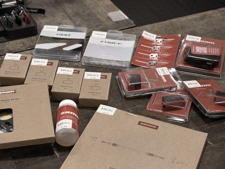 残念ながら当店は認定外ですが、SRAMユーザーが急激に増えていることを加味し、コンポーネントはもちろん、ブレーキパッドやチェーン、ブレーキホース、DOTオイル、充電器、バッテリーなど「これはお店ですぐ買えないとまずい」と思ったパーツは在庫するようにしています。