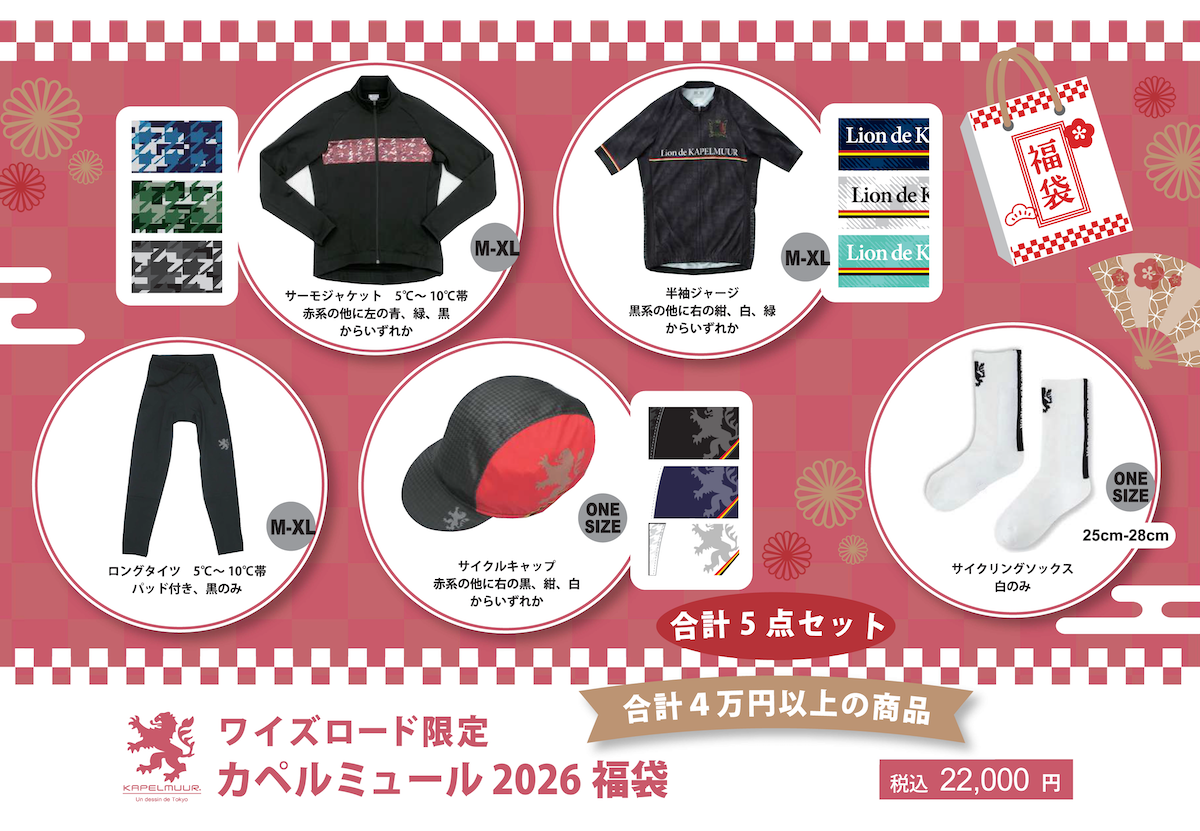 カペルミュールのウェア福袋は、5℃〜10℃に対応するサーモジャケット、10℃に対応する裏起毛ロングタイツに加え。夏の備えも出来ちゃう半袖ジャージ、メッシュ サイクルキャップ(それぞれカラーはランダムとなります)、さらにサイクリングソックスの5点セット、総額50,820円(税込)相当の内容となっております。