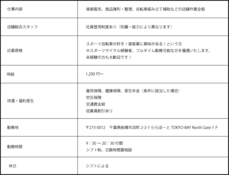 販売が得意な人、自転車の整備が得意な人、ポップ作りやMDが得意な人、数字に強い人