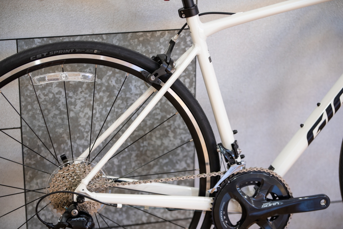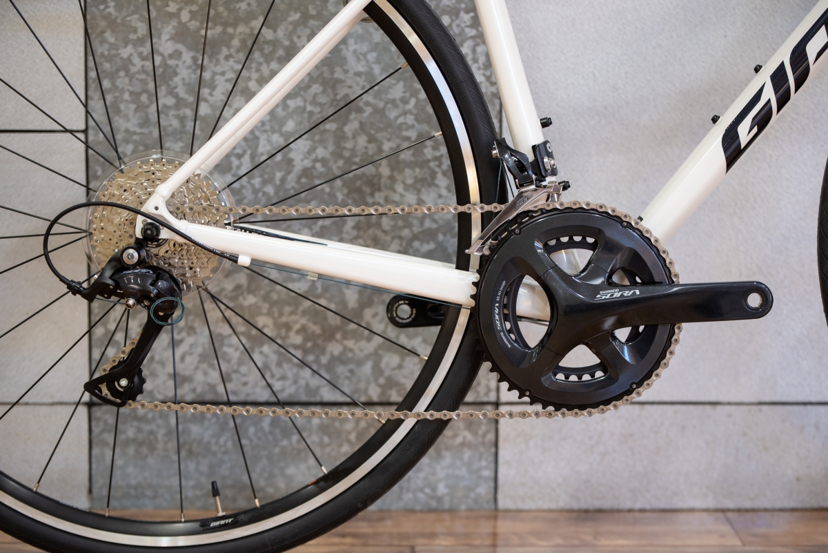 コンポーネントは「SHIMANO SORA」グレードを搭載しており変速がスムーズかつ操作性も定評があります。日常のライドからロングライドまで幅広く適応しているイメージ。