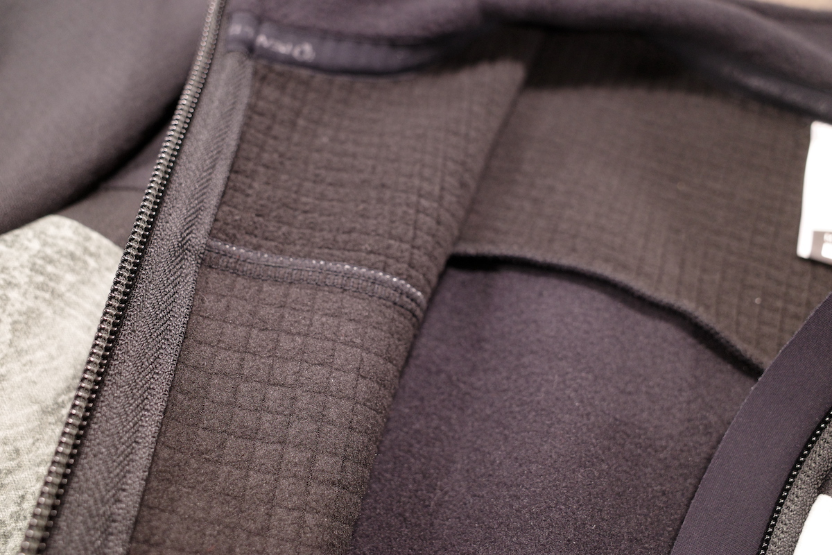 内側はグリッド状の起毛素材を使用。遠赤外線保温機能による高い保温性を発揮。透湿性能によってムレも軽減します。