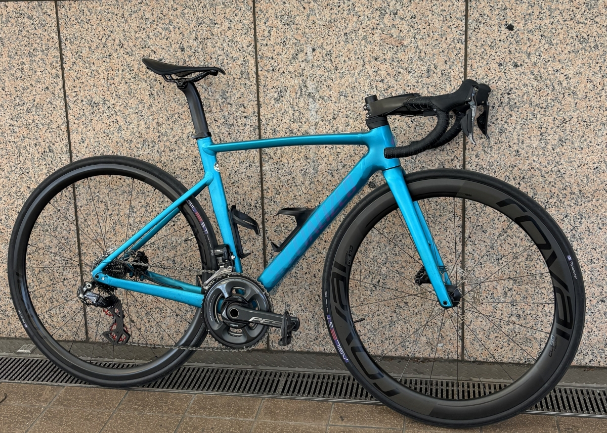 他社製のフレーム、ホイールにShimano 6870シリーズとSimano r8050シリーズでミックスした構成で、ハンドルもShimano製を使用しており、Shimano pro vibe エアロパシュートを使用しており、快適性、軽量化というよりかはエアロと剛性を意識した構成で組んでいます。タイヤはコストパフォーマンス、転がりに優れたPanaracer Agilest 28をチョイス。ステムに剛性の高いトラック用の物を使用したり、後輪をローハイトにすることで加速性能を向上させています。