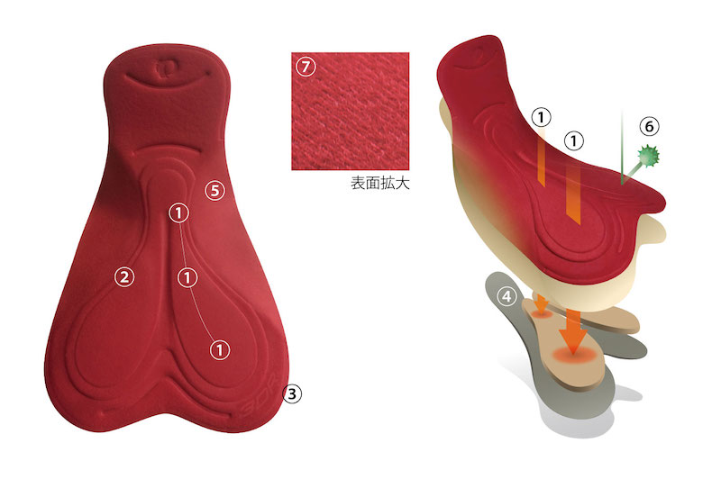 「3DR」パッドは、3層構造のクッションを適所に配置した、あらゆる乗車姿勢に対応するオールラウンドパッドです。