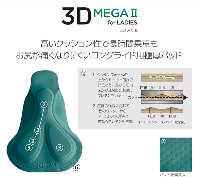 極厚パッドの女性専用設計「3D MEGA Ⅱ for LADIES」パッドを搭載したローライズ仕様の女性用のメッシュ インナーパンツです。男性モデル同様に柔らかなクッションでお尻が痛くなりにくいロングライド用極厚パッド搭載インナーパンツです。