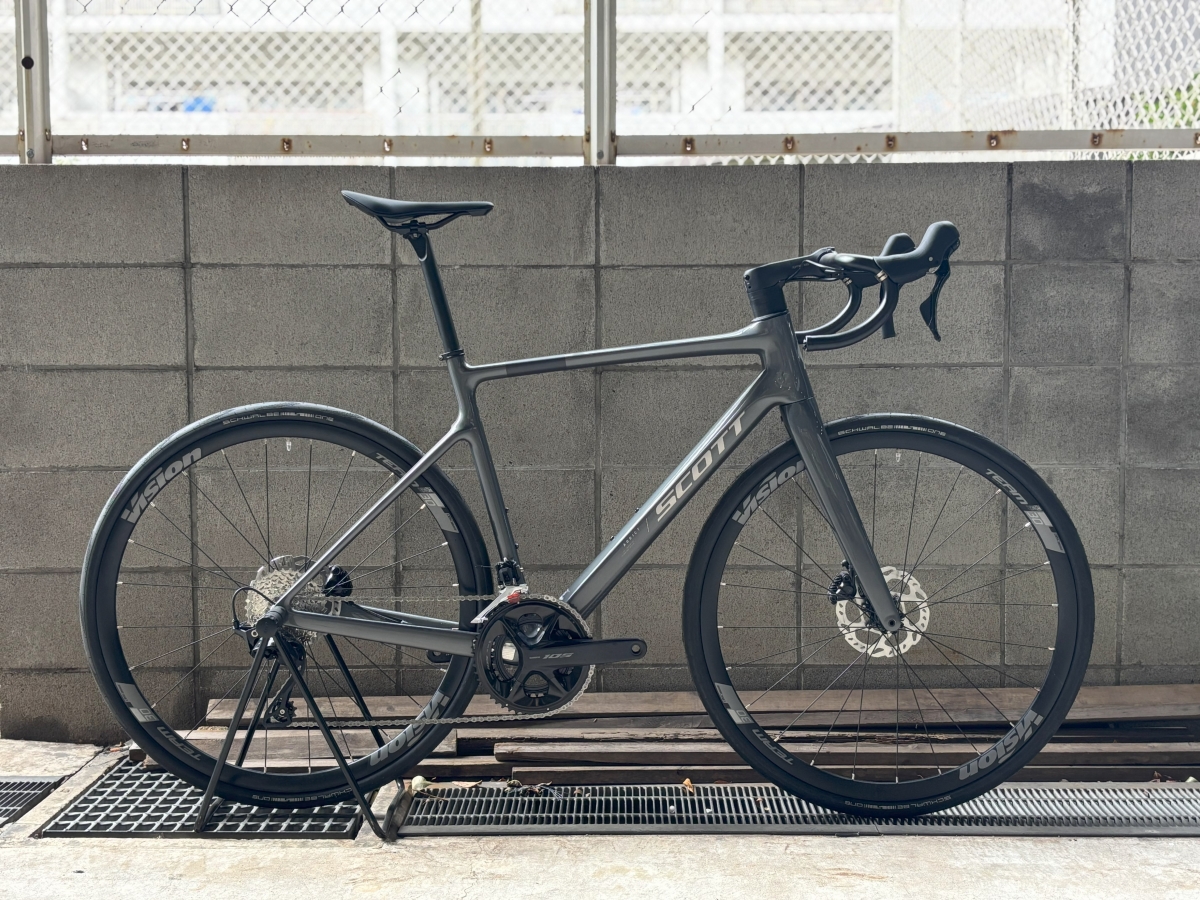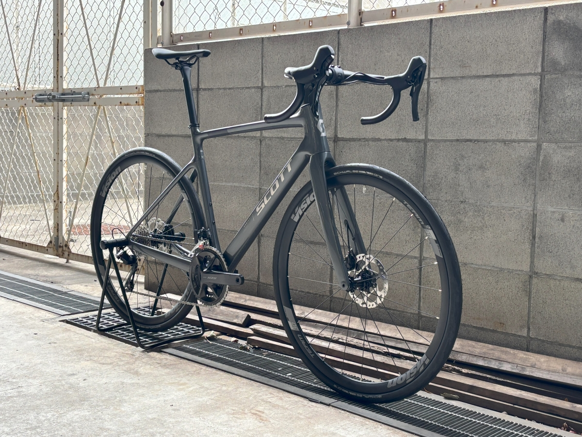 セール中の車体となります。現在SCOTTには通常のADDICTとADDICT RCが存在します。こちらのフレームは通常のADDICTです。RCはピュアレーシングフレームとして作られているのですが、こちらのバイクはエンデュランスバイクとして設計されています。しかし、ある程度の剛性を持つフレームなので、不足感が少なく、オールラウンドに使用できるバイクになります。