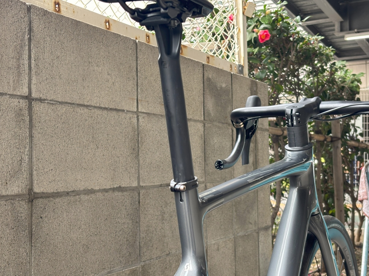 フレームは一世代前のモデルのため、ダウンチューブ下のストレージはありません。無駄をそぎ落としたい人ならこちらがあってる人も少なくないと思います。元々ついてくるシートポストも高性能なカーボン製シートポストなのですが、より汎用性の高い丸形状のため、お好きなシートポストに変更可能です。