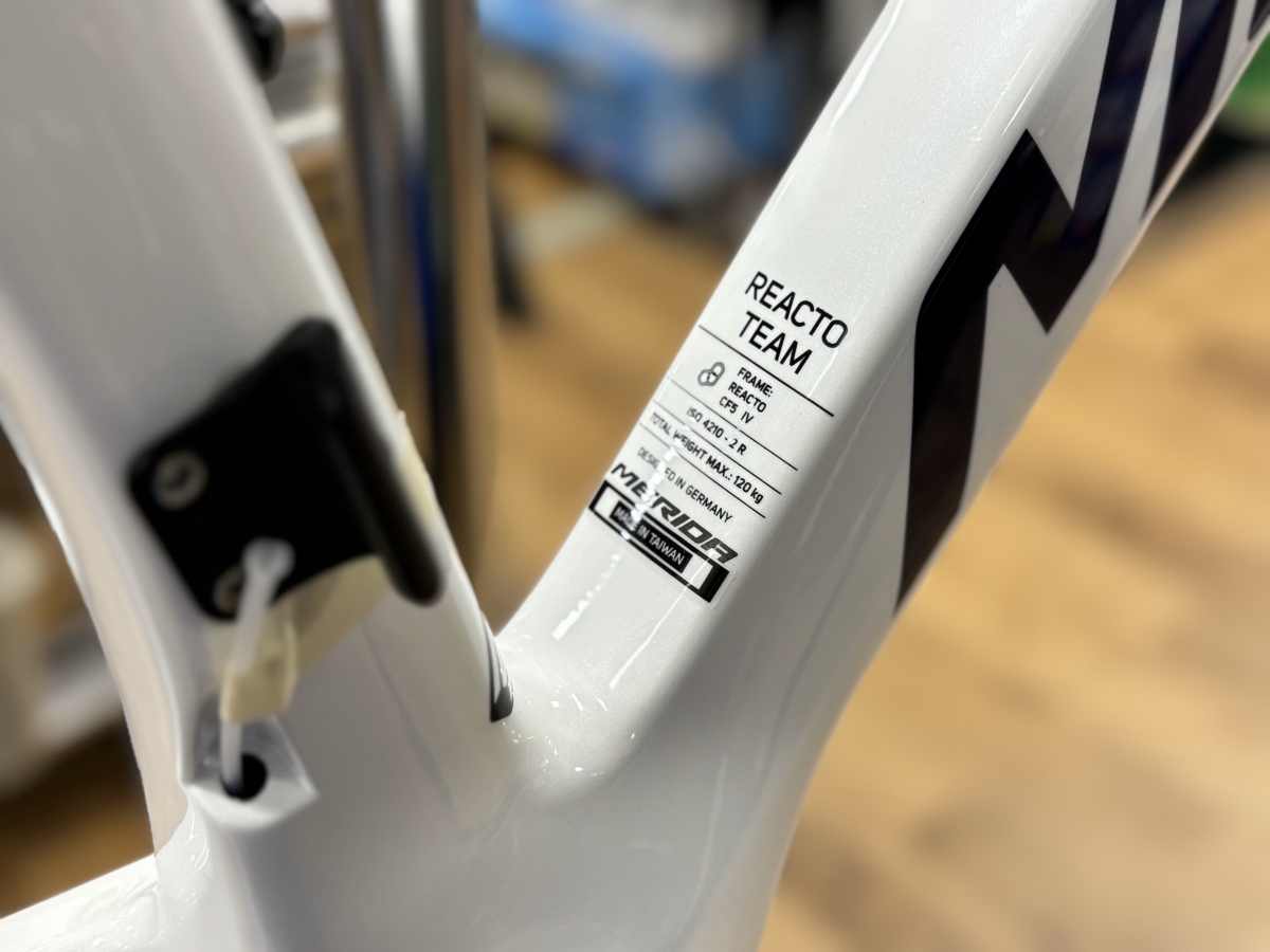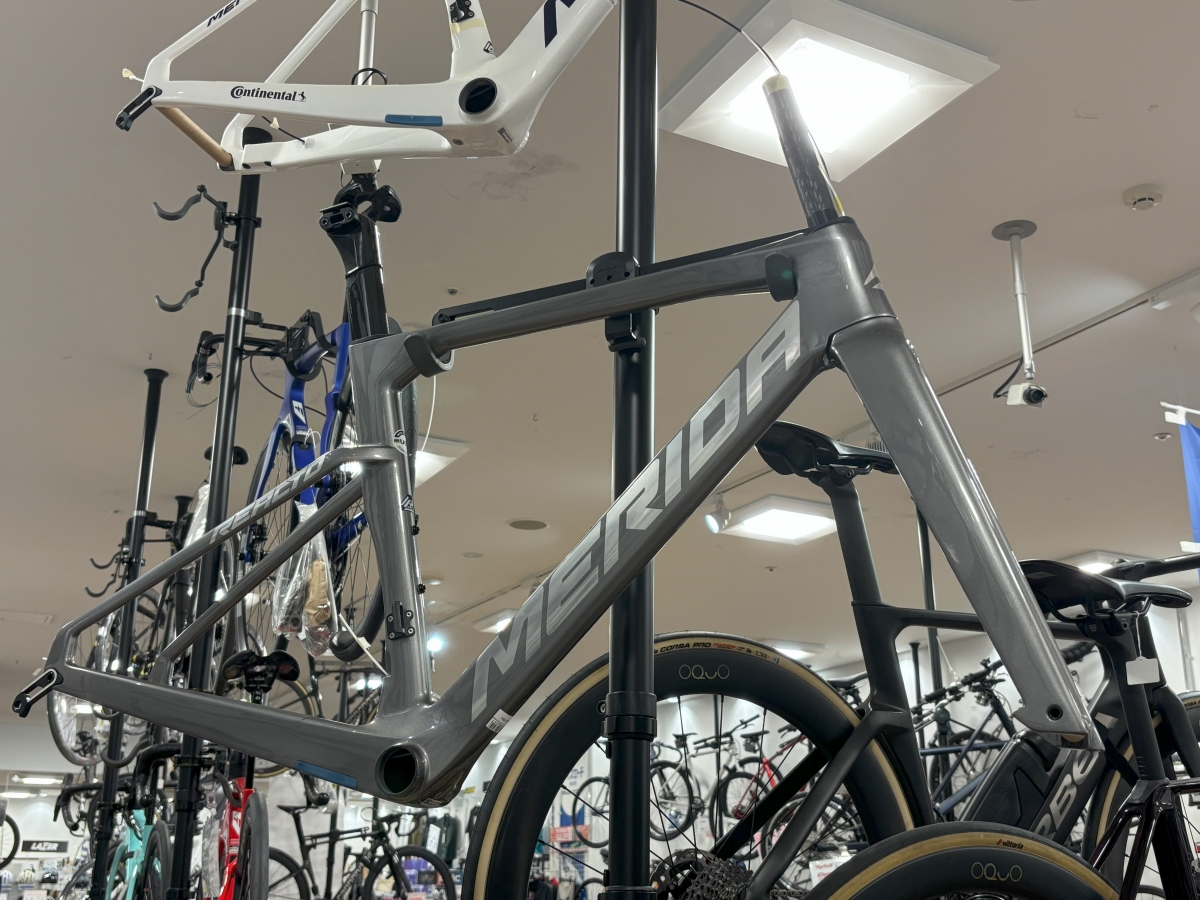 同世代のエアロバイクと比較したら平均的な重量です。メリダ独自のカーボン繊維であるCF5というハイエンドなカーボン繊維を