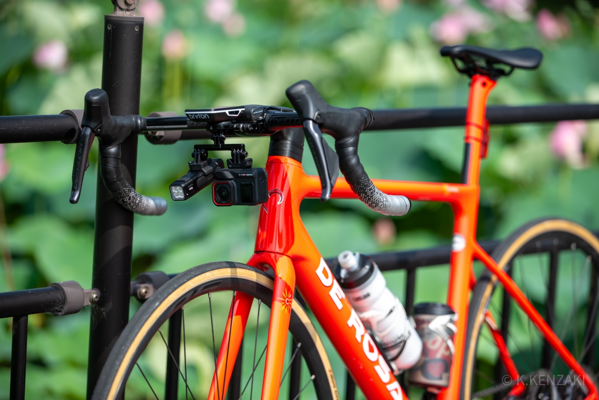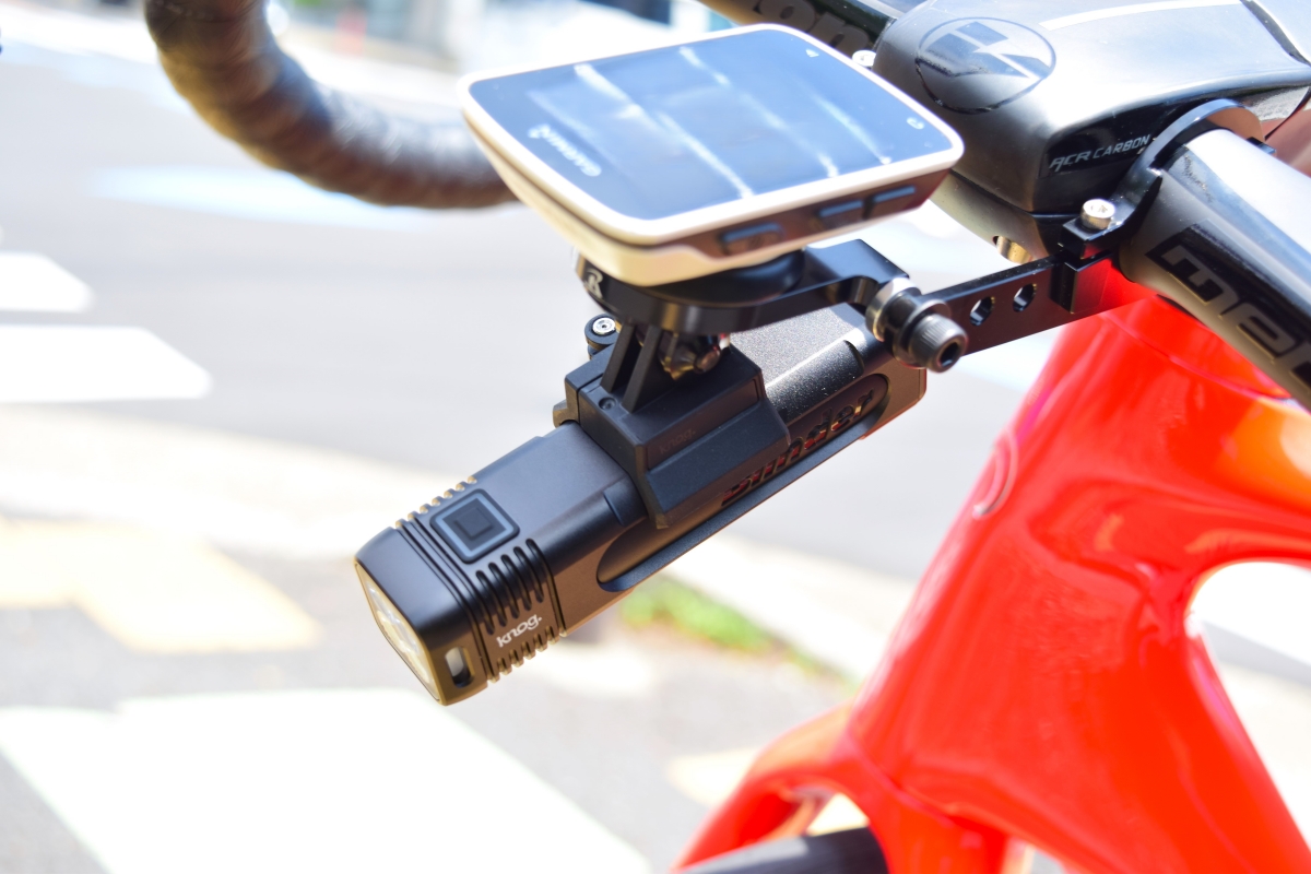 私自身も同社のマウントを愛用しており、下の画像のようにサイクルコンピューターの下にライトやアクションカメラを取付してハンドル周りをスッキリさせています。
