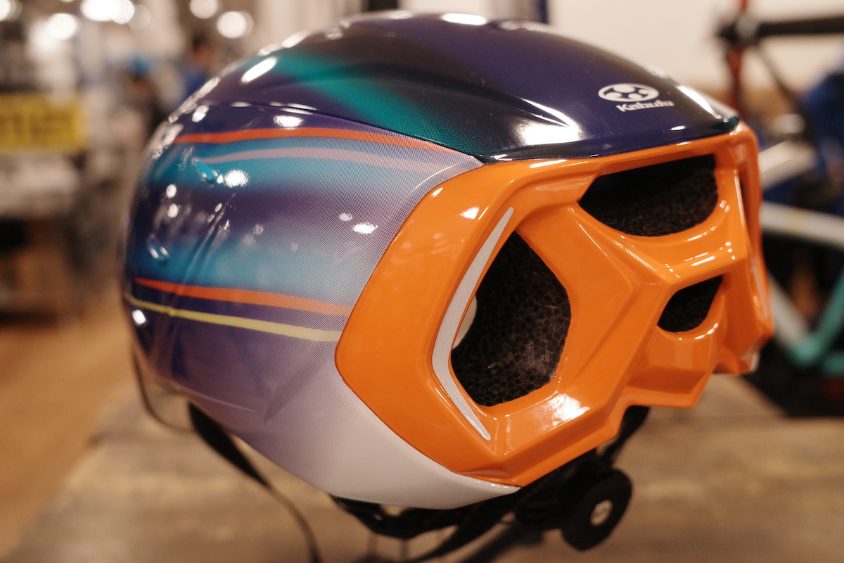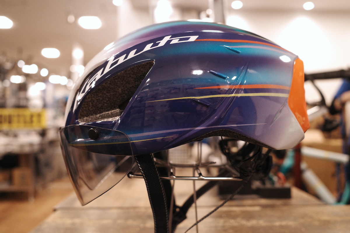 ホワイトをベースに、側頭部にはチームカラーのブルーを、後頭部にはビビッドなオレンジを配色。前方から後方に流れるようなシャープなラインが「AERO-R2」の持つスピードと洗練されたレーシングイメージを象徴します。