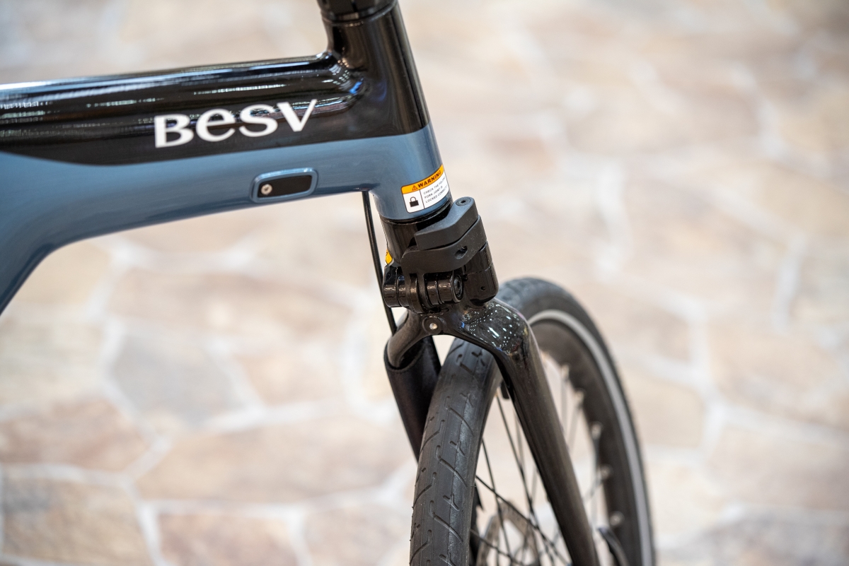 フロントフォークが他社に比べて前の方にベントしていることで安定性の向上を実現。街乗りでの安定性、快適性に貢献しています。