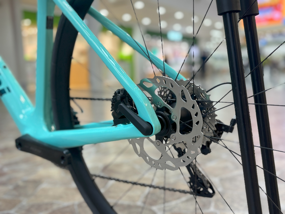 特徴としてまず挙げられるのが、タイヤクリアランスの広さ。標準で32Cのタイヤを履ける余裕があり、路面状況を選ばず安定した走りができます。また、リアにも160mmのディスクローターを採用しているため、荷物を積んだ状態でもしっかりとした制動力を確保できます。