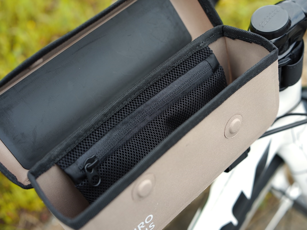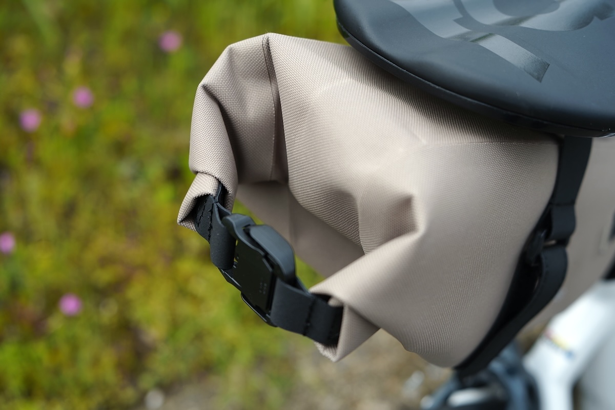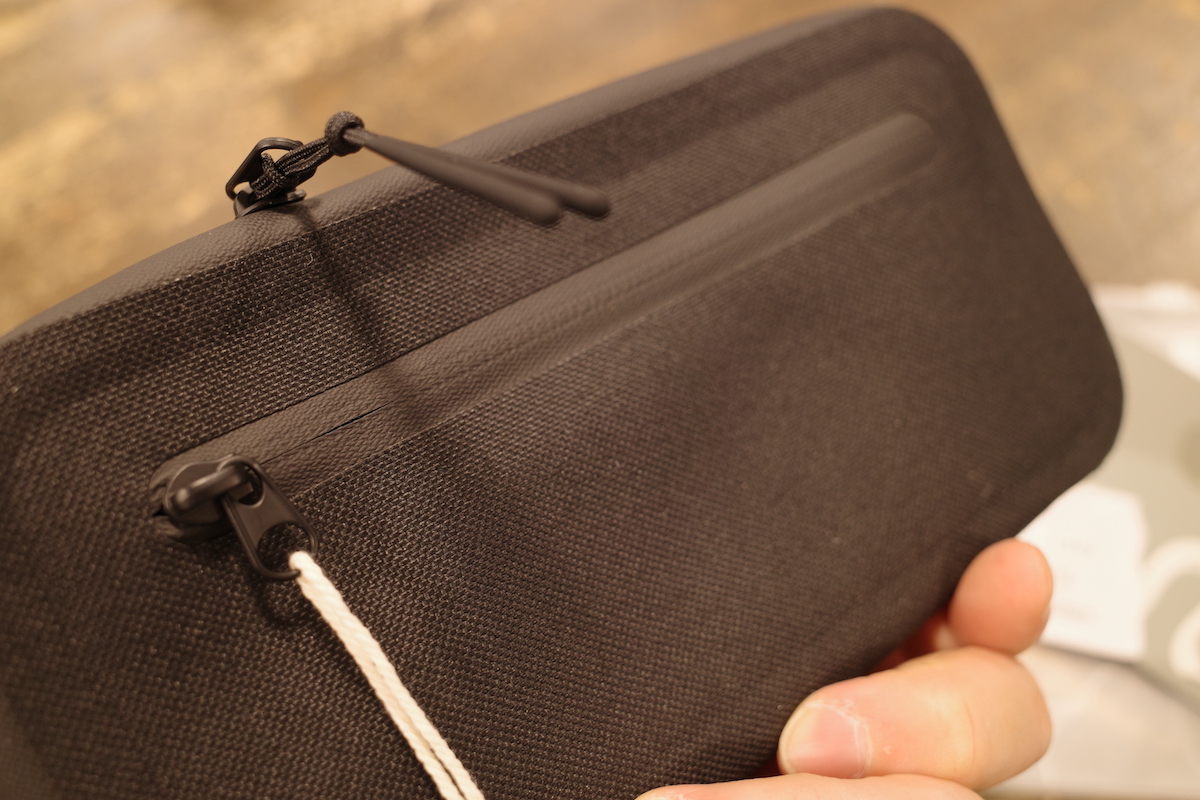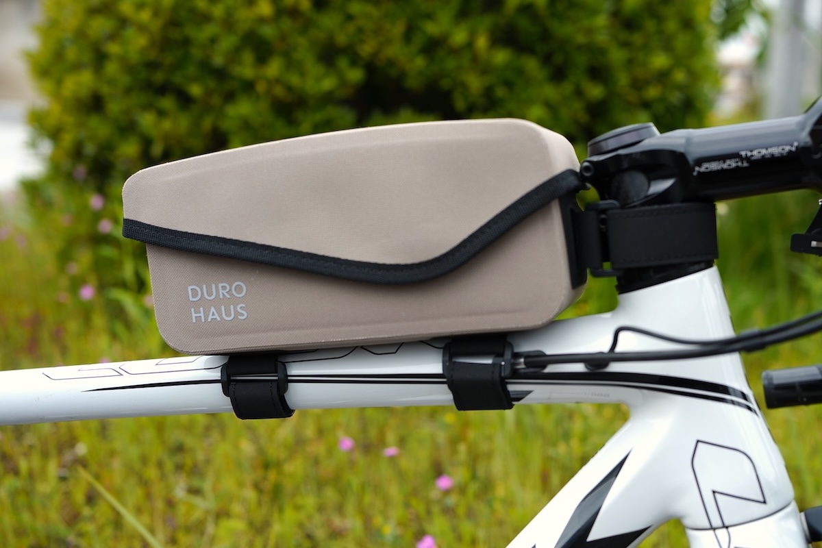 高耐久の防水素材 600D TPU素材を使用したトップチューブバック。こちらもバイクの景観を損ねないシンプルなデザインです。