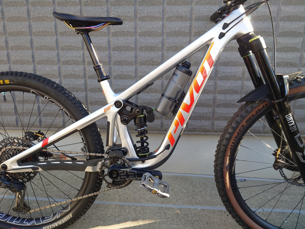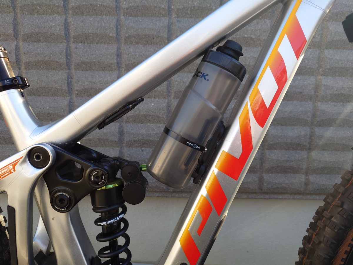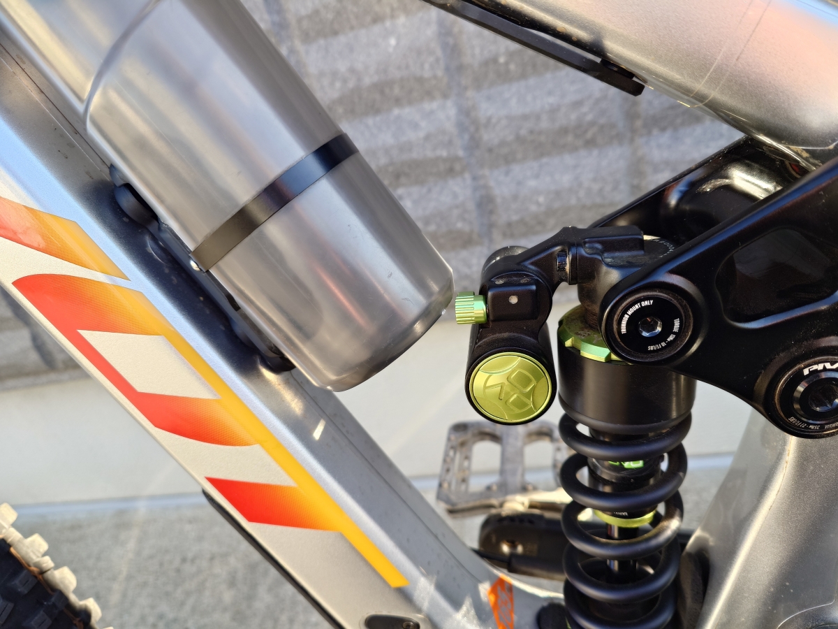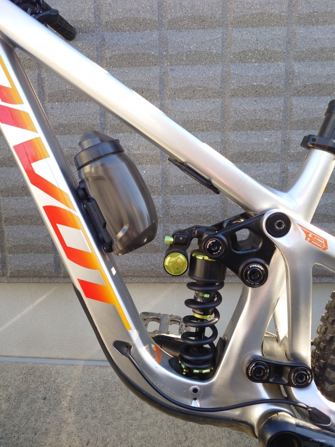 なんとボトルの底がリアサスユニットのコンプ切り替えレバーに干渉し走行中にレバーの位置が変わってしまう!さらに、ボトルの頭ががっつりフレームに当たってしまうので強めに押し込まないと装着できない!という問題が!ががが!