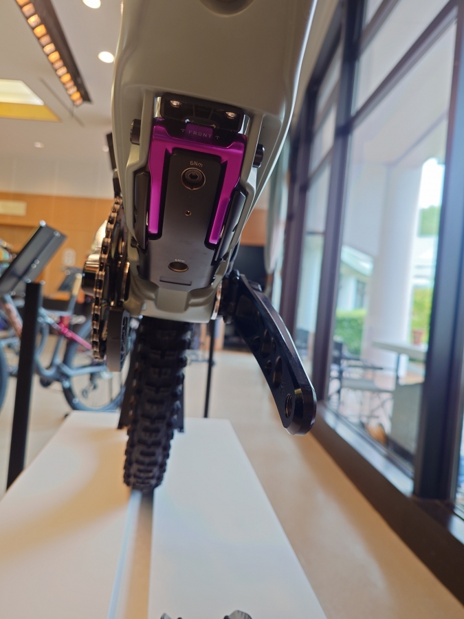 操作性の高い275ホイールですが車体の安定感と両立させるため、チェーンステイ長は長くなっていてロングホイールベースなバイクになっています。しかも調整可能で450㎜と442㎜を選べます!