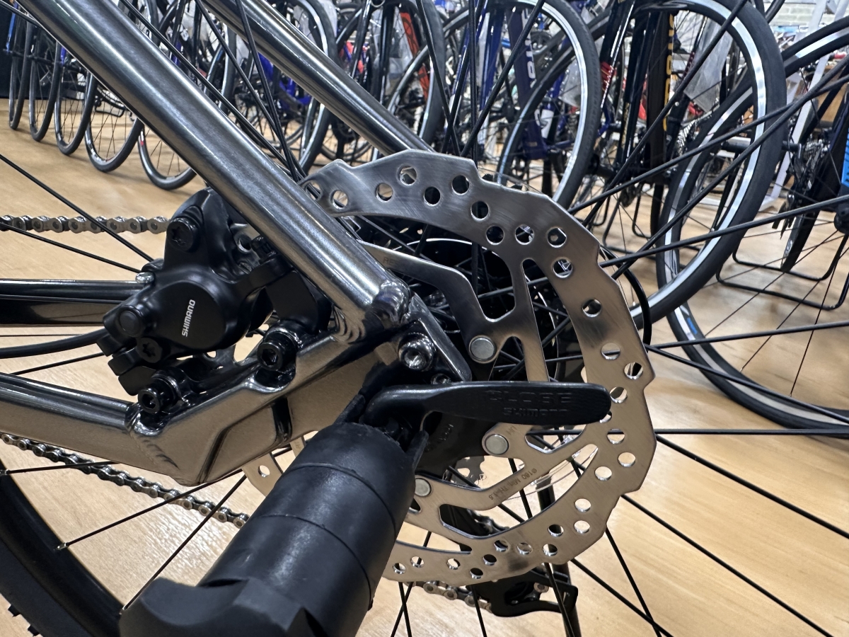 油圧ディスクブレーキ搭載で雨の日の通勤や通学でも安全に軽い力でブレーキが利きます。